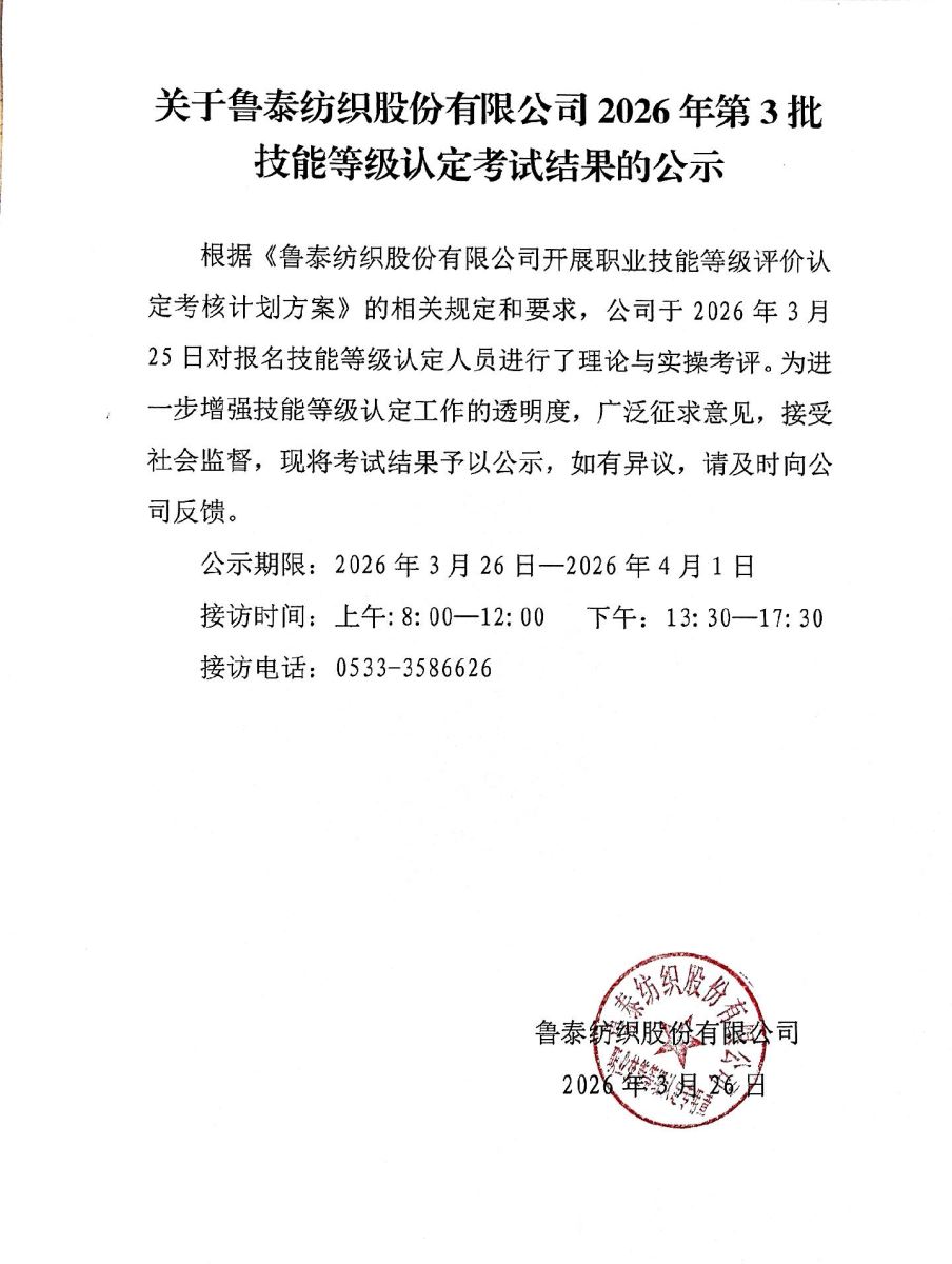 关于鲁泰纺织股份有限公司2026年第3批技能等级认定考试结果的公示