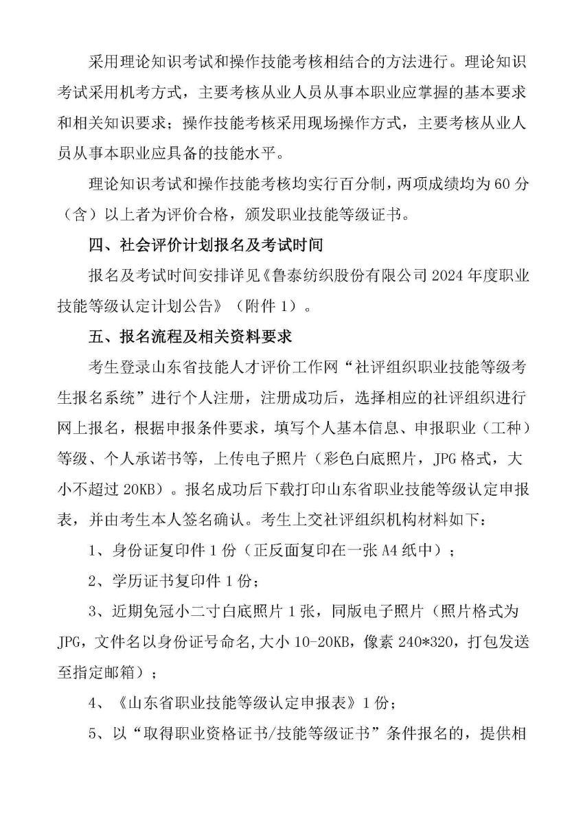 鲁泰纺织股份有限公司社会评价组织职业技能等级认定公告