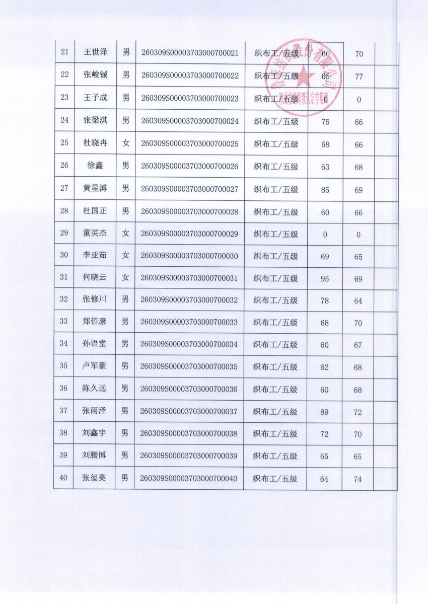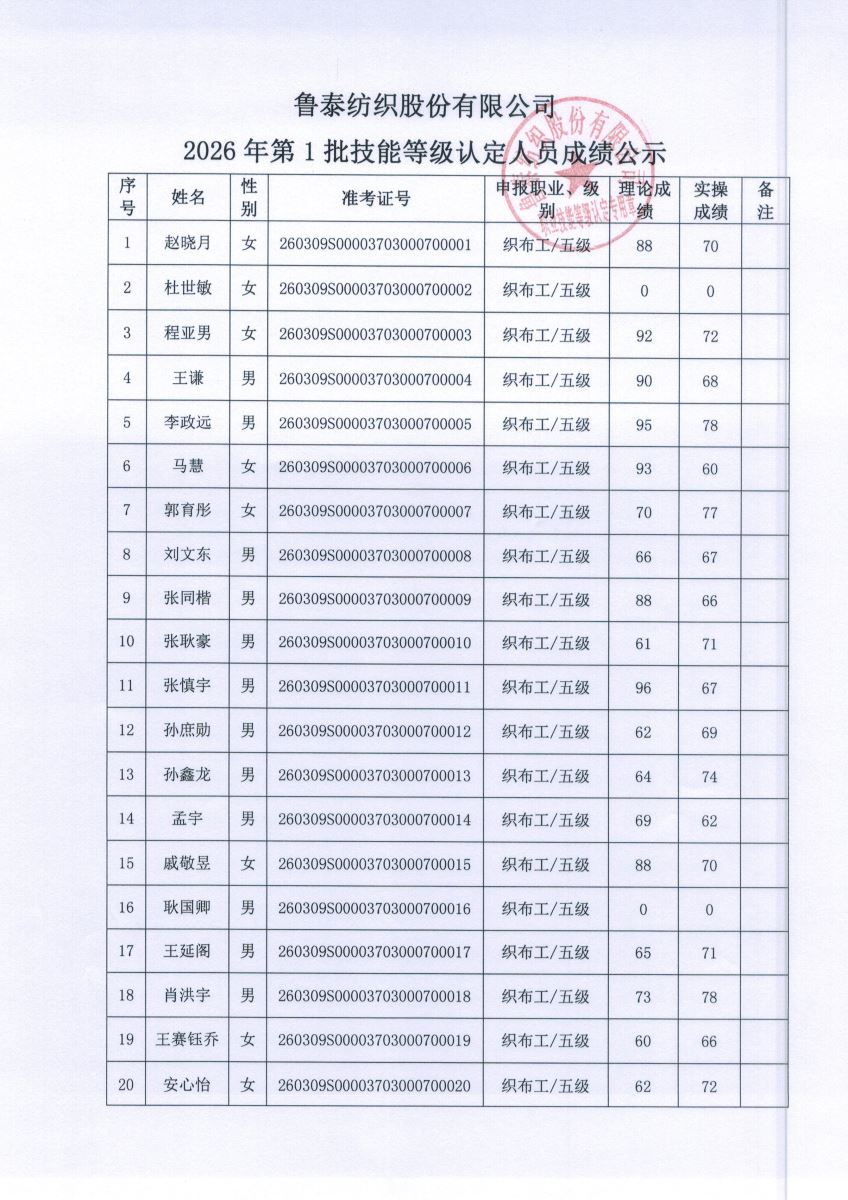 关于鲁泰纺织股份有限公司 2026 年第1批技能等级认定考试结果的公示